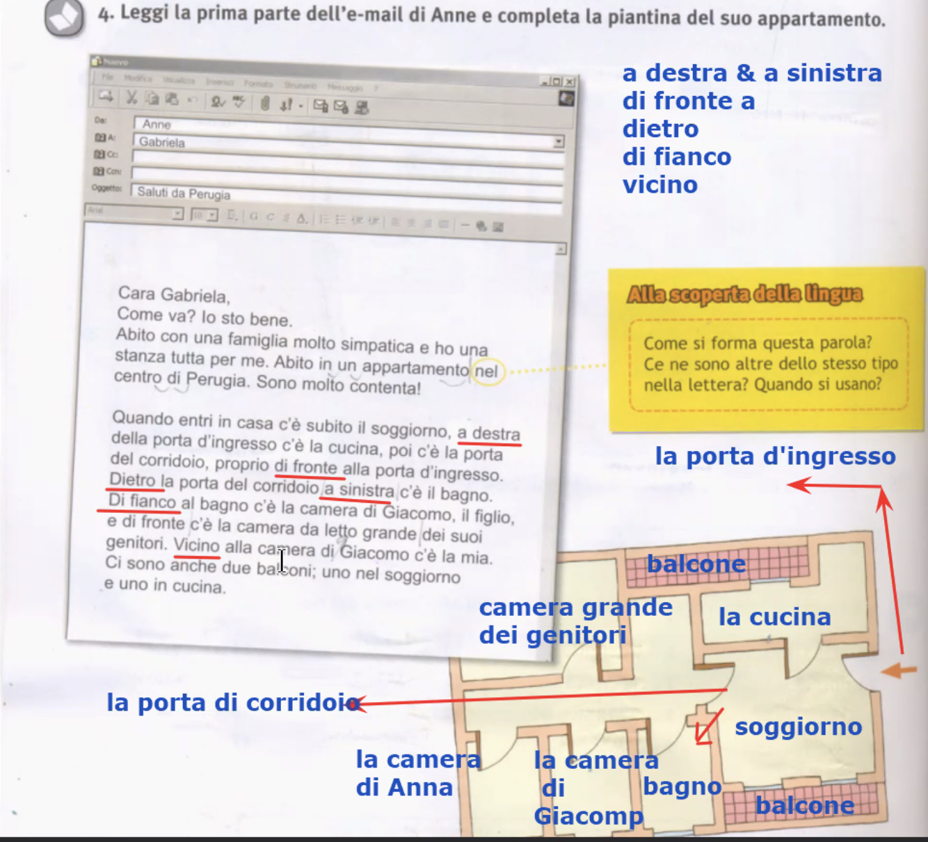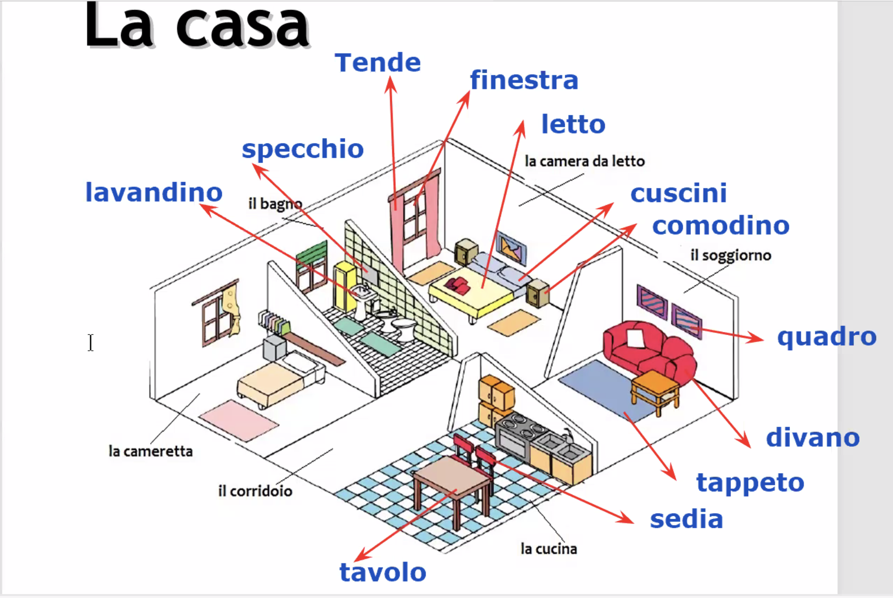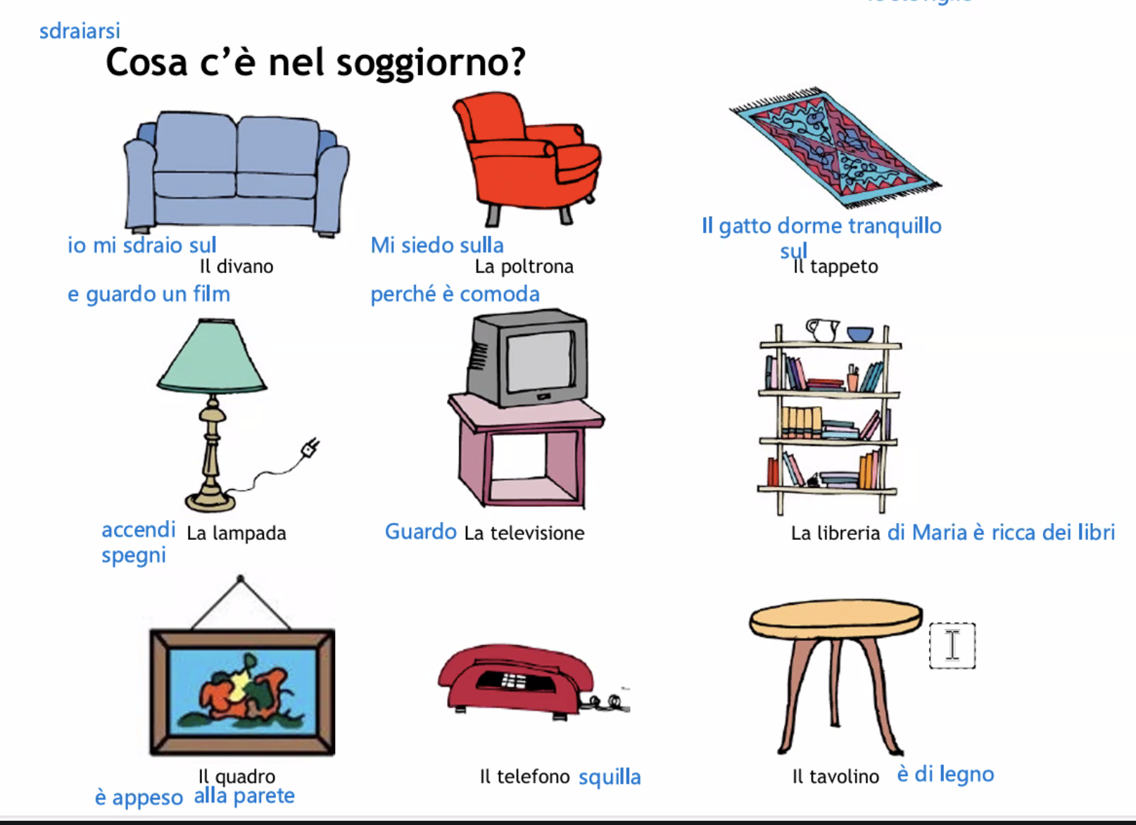 A destra della porta d’ingresso c’è il soggiorno. Nel soggiorno ci sono una finestra, un televisone, un tavolo e un divano.