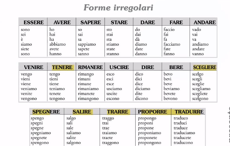 Verbi Irregolari al Presente Indicativo (Traduzione in Inglese & Esempi)