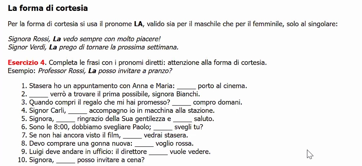 Esercizio 4. Completa le frasi con i pronomi diretti: attenzione alla forma di cortesia.